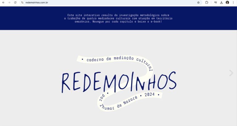 Criação do produto Redemoinhos, por Zhumar de Nazaré (Josimar Dantas). Trata-se de um caderno de mediação cultural, disponibilizado como site e como e-book, que descreve ações, estratégias e habilidades de mediação cultural articuladas ao movimento cultural de Marabá (PA). Site: https://redemoinhos.com.br/