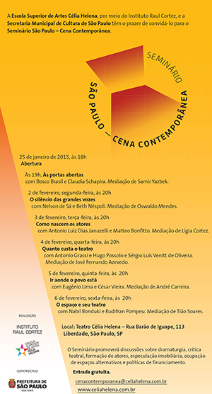 Em seis encontros temáticos, o Seminário São Paulo – Cena Contemporânea, uma realização da Escola Superior de Artes Célia Helena – ESCH com copatrocínio da Secretaria Municipal de Cultura de São Paulo, convidará o teatro a pensar a metrópole e a metrópole a pensar o teatro, reconhecendo a importância dos encontros que não se limitam à mera troca de cortesias, mas que aceitam o embate e a instauração da crise de pensamento como espaço privilegiado para a produção luminosa de ideias. Nesse itinerário, serão discutidos, no contexto do teatro praticado na cidade de São Paulo, temas como a produção em dramaturgia, a atuação dos críticos, a formação de atores, as políticas públicas de financiamento, a ocupação de espaços alternativos e, ainda, a cada vez mais crescente tensão entre especulação imobiliária e constituição de espaços teatrais – cobrindo, assim, um espectro significativo dos problemas que constituem, atualmente, o lugar do teatro da metrópole e o lugar da metrópole no teatro.